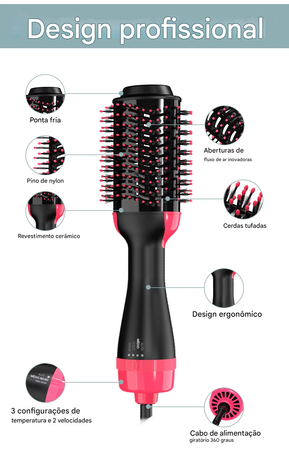 Design ergonômico e leve: confortável para o uso diário, mesmo em cabelos longos e volumosos.