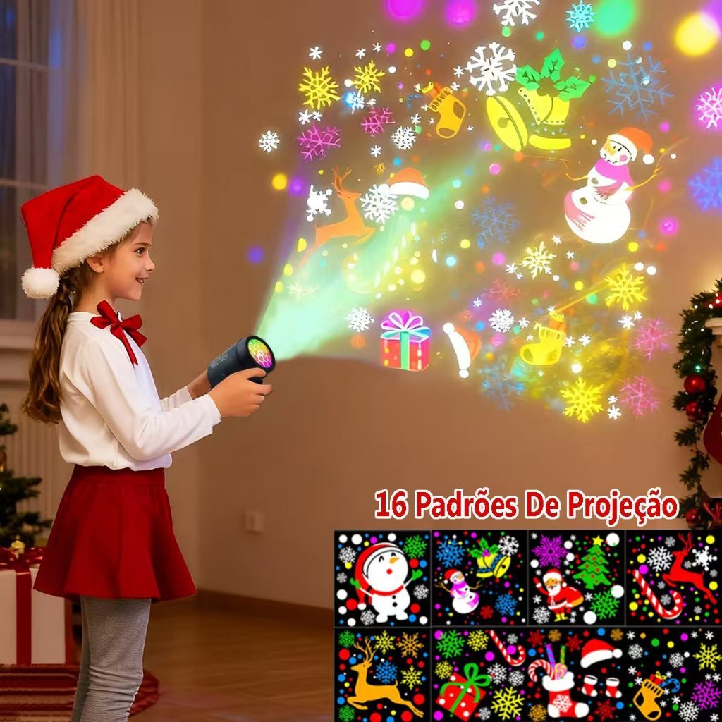 Dê vida à sua decoração com o Projetor Natalino 3D, que projeta 16 imagens temáticas em movimento, criando um ambiente mágico, moderno e encantador — sem esforço e sem bagunça.